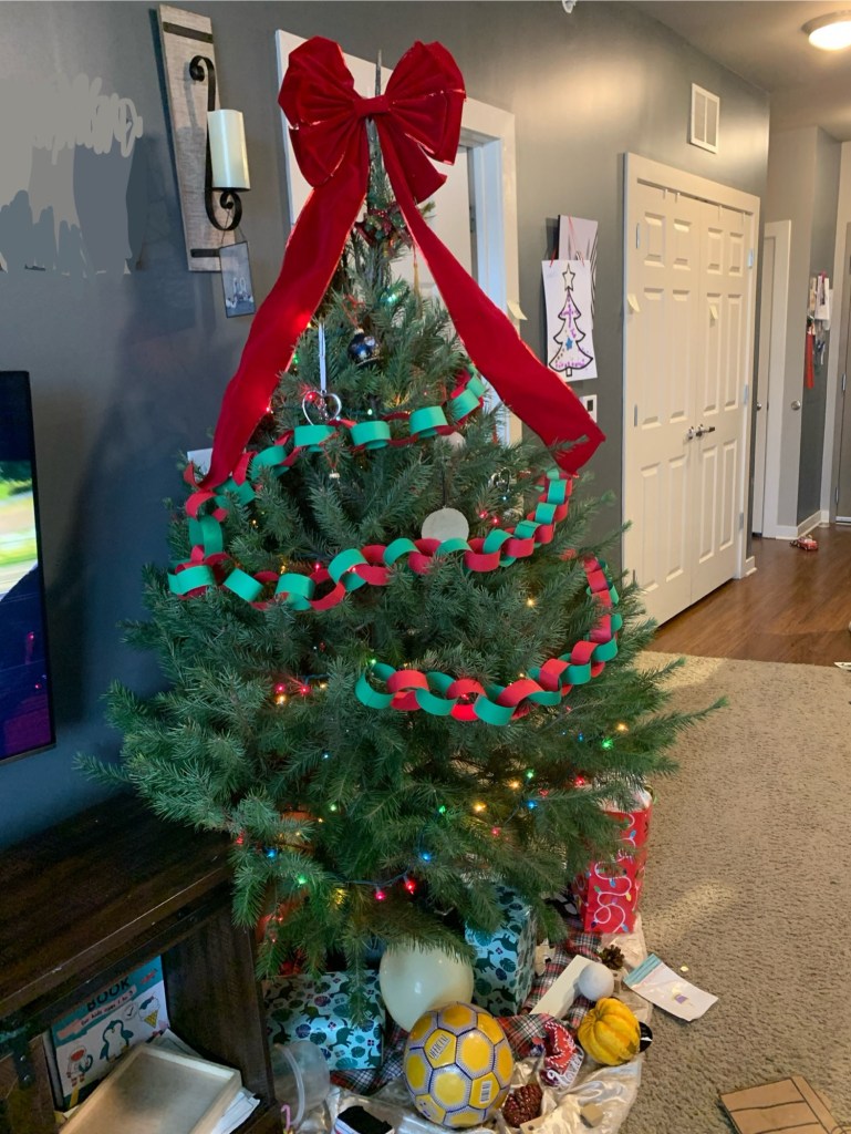 This year feels much more relaxed than last Christmas. We got our tree the weekend after Thanksgiving, and very lightly decorated it (we have a toddler, you know). He helped to remove some decorations, so it was looking sparse for a while. I tried making paper chains this week, in alternating hues of green and red, and wrapped them on the tree. It lends such a festive, cheery look. I had never made paper chains before, but I think I would like to do it again!